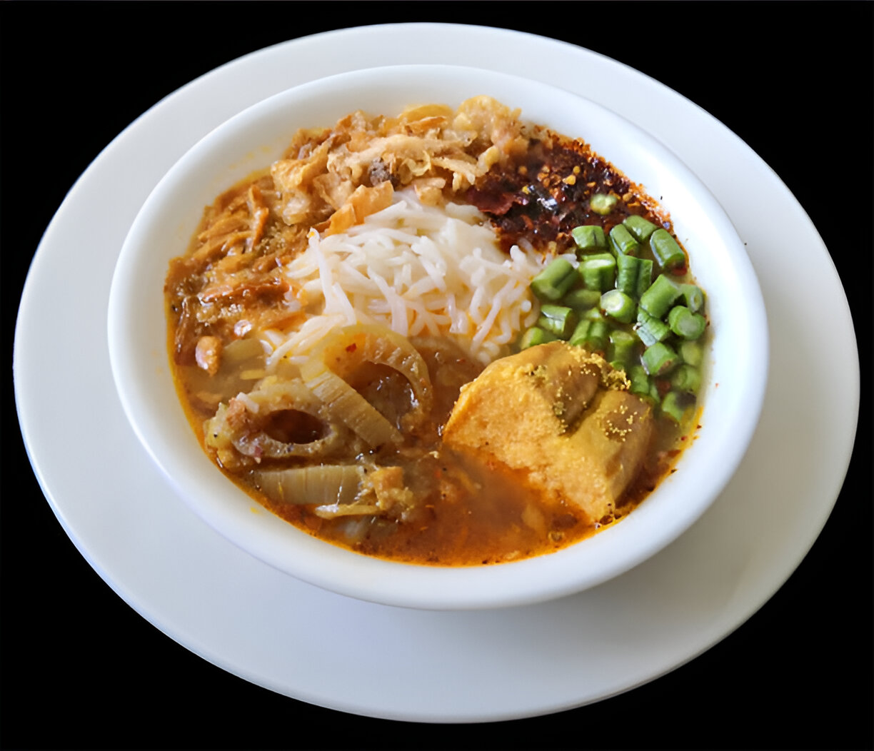 Mohinga is widely regarded as the national dish of Myanmar and is a favorite comfort food for many. It consists of rice noodles served in a savory fish-based broth, which is thickened with crushed rice and flavored with lemongrass, ginger, garlic, onions, and banana stem. The soup is aromatic and rich, offering a perfect balance of flavors. It is typically topped with crispy fritters, sliced boiled eggs, coriander, and sometimes fish cakes or banana stem slices. Mohinga is most commonly eaten for breakfast, but it’s available all day from street vendors and teashops. The recipe may vary slightly by region, but its deep flavor and satisfying warmth make it a beloved dish across the country and a true symbol of Myanmar’s culinary heritage.